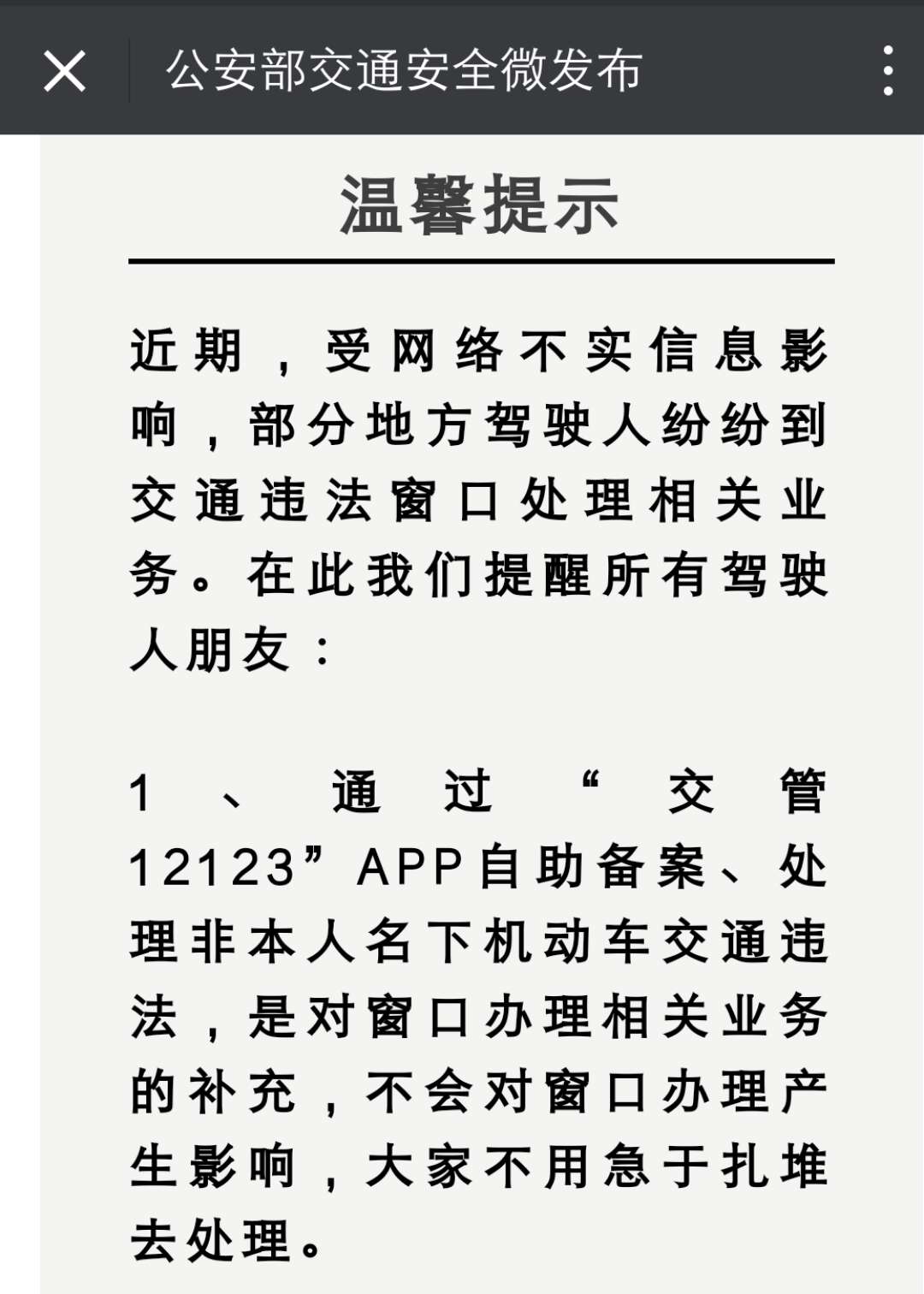2月26日,公安部交通管理局通過官方微信發(fā)布文章,對新增項目推出后群眾提出的問題進(jìn)行答疑,并提醒駕駛?cè)伺笥逊Q“通過‘交管12123’APP自助備案、處理非本人名下機(jī)動車交通違法,是對窗口辦理相關(guān)業(yè)務(wù)的補(bǔ)充,不會對窗口辦理產(chǎn)生影響,大家不用急于扎堆去處理。”同日,北京交警也通過官方微信辟謠稱“3月1日起,不綁定備案就不能處理非本人名下車輛違法”系誤讀,并提示:在北京市,不通過網(wǎng)上渠道處理非本人名下機(jī)動車交通違法的車主,依然可以通過各交通支、大隊執(zhí)法站窗口辦理。