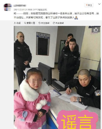 與此類似的謠言還有“在某某路派出所接收一名走失女孩,說不出父母電話號,說不出住址,大家?guī)兔D(zhuǎn)發(fā)吧,春節(jié)了讓孩子快點(diǎn)找到親人”。經(jīng)警方核實(shí),該事發(fā)生在四川省自貢市,女孩已于2月13日被其父母接回。該謠言在全國多個省市傳播,各地網(wǎng)警紛紛辟謠,請大家不要繼續(xù)傳播!