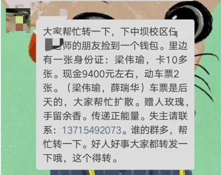 一條“失物招領(lǐng)”的信息在全國多地的微信群和朋友圈中熱傳,該信息稱:“我朋友撿到一個錢包,里邊有一張身份證:梁偉瑜,卡10多張,現(xiàn)金9400元左右,動車票2張(梁偉瑜,薛瑞華)。車票是后天的,大家?guī)兔U(kuò)散。贈人玫瑰,手留余香。傳遞正能量。失主請聯(lián)系:1362098XXXX。誰的群多,幫忙轉(zhuǎn)一下……”