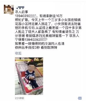 近日,多地網(wǎng)民轉(zhuǎn)發(fā)圖片稱“今天上午寧繼春的三歲女兒在錦繡花園小區(qū)附近被人拐走了,女兒能說出她爸爸的手機(jī)號碼……從監(jiān)控上看,小女孩是被一個四十多歲男人抱走了,現(xiàn)大人都急瘋了,有知情者請告之。萬分感謝……”