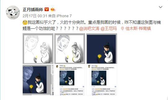 17日凌晨,該圖的原作者“正月插畫師”,微博認(rèn)證為“插畫師、美術(shù)教師”,發(fā)布消息稱“我這畫似乎火了,火的十分突然。重點(diǎn)是我畫的時候,咋不知道這張圖與錦鯉是一個功效的呢??????”