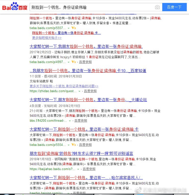 但是,經(jīng)警方調(diào)查,網(wǎng)傳消息中的聯(lián)系電話一直無法接通。該手機(jī)號碼的歸屬地顯示為廣東深圳,并被多個用戶標(biāo)記為騷擾電話。通過搜索發(fā)現(xiàn),這條“失物招領(lǐng)”在網(wǎng)絡(luò)上已經(jīng)流傳很久。除了失主的姓名“梁偉瑜”“薛瑞華”沒變之外,聯(lián)系人的電話號碼卻出現(xiàn)過多個版本,類似的“失物招領(lǐng)”虛假信息也有很多。網(wǎng)絡(luò)中流傳“徐俊峰”“劉馨心”等多人丟失錢包的網(wǎng)帖,同樣都被證明為謠言。可見,所謂的“失物招領(lǐng)”實(shí)際上是一條“陳年老謠”,只要把其中的姓名、聯(lián)系方式等信息進(jìn)行替換,這條謠言便又能改頭換面,重新在網(wǎng)絡(luò)中流傳。