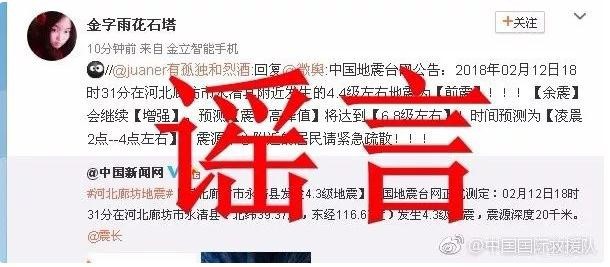 12日20時左右,有人假冒中國地震臺網(wǎng)公告,稱“【余震】會繼續(xù)【增強(qiáng)】。預(yù)測【震中高峰值】將達(dá)到【6.8級左右】!時間預(yù)測為【凌晨2點(diǎn)--4點(diǎn)左右】!震源中心附近的居民請緊急疏散!”12日21時39分, “廊坊發(fā)布”回應(yīng)稱,“經(jīng)與權(quán)威部門核實(shí),以上內(nèi)容純屬造謠。”。