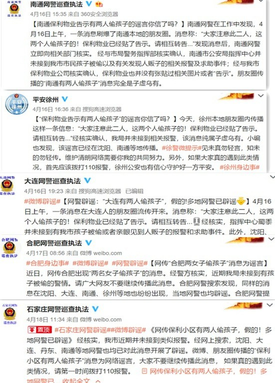 4月16日,沈陽(yáng)網(wǎng)警官微回應(yīng)稱:經(jīng)核實(shí),沈陽(yáng)市公安局指揮中心并未接到有該市市民孩子被偷或者親眼見(jiàn)到人販子的報(bào)警及市民求助事件。丹東網(wǎng)警官微也表示:經(jīng)與該市保利物業(yè)公司核實(shí)確認(rèn),保利物業(yè)也并沒(méi)有張貼過(guò)相關(guān)圖片或者“告示”。