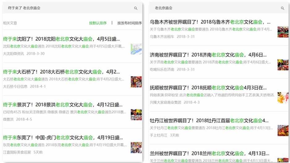 此類消息打出“高品質的游玩盛會、高規(guī)格的城市經典”的噱頭,聲稱“廟會門票免費送”,呼吁大家“隨手一曬到盆友圈,讓更多的人知道”,并且介紹了舞獅舞龍、二人轉、踩高蹺、民俗手工藝等等的廟會活動,鋪排了大量的美食照片,達到博人眼球的效果。
