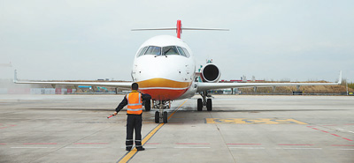 | 圖為5月2日,ARJ21—700新支線噴氣客機(jī)駛進(jìn)哈爾濱太平國際機(jī)場停機(jī)坪。(記者 丁汀 攝) |