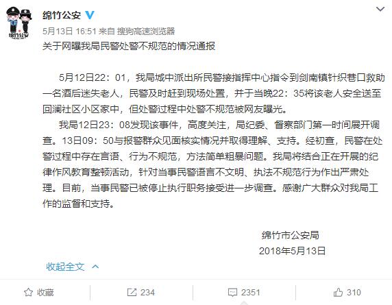 5月13日下午,綿竹市公安局官方微博對(duì)此事進(jìn)行了通報(bào):5月12日22:01,綿竹市公安局城中派出所民警接指揮中心指令到劍南鎮(zhèn)針織巷口救助一名酒后迷失老人,民警及時(shí)趕到現(xiàn)場(chǎng)處置,并于當(dāng)晚22:35將該老人安全送至回瀾社區(qū)小區(qū)家中,但處警過程中處警不規(guī)范被網(wǎng)友曝光。