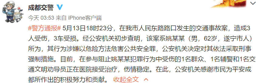 5月14日凌晨3時(shí)53分,成都交警通報(bào),此事故造成3人受傷,3車受損。經(jīng)當(dāng)?shù)毓矙C(jī)關(guān)初步查明,該案系62歲遂寧市姚某某所為,其行為涉嫌以危險(xiǎn)方法危害公共安全罪,公安機(jī)關(guān)決定對其依法采取刑事強(qiáng)制措施。目前,在參與阻止姚某某犯罪行為中受傷的1名群眾、1名輔警和1名交通文明勸導(dǎo)員正在醫(yī)院接受治療,傷情穩(wěn)定。公安機(jī)關(guān)感謝市民為平安成都所作出的積極努力和貢獻(xiàn)。