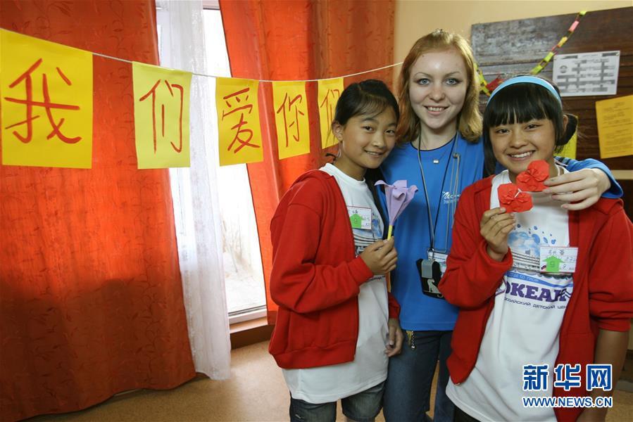 2008年7月21日,在“海洋”全俄兒童中心,兩個(gè)中國(guó)小姑娘和她們的折紙課老師合影留念。圖片來源:新華社ynf安康新聞網(wǎng)