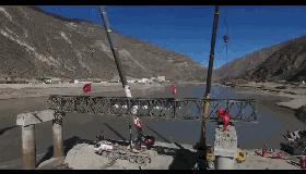 11月25日12時40分,經(jīng)過武警某部交通三支隊官兵連續(xù)晝夜奮戰(zhàn),被沖毀的金沙江大橋成功吊裝起第一跨,標志著318國道搶通取得突破性進展。