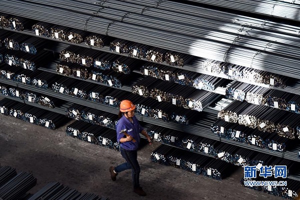 11月17日,福建省三明市三鋼集團的工人走過成品堆放區(qū)。新華社記者 姜克紅 攝