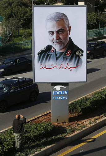 2020年1月6日,在黎巴嫩首都貝魯特,一名男子向在美國(guó)空襲中被炸身亡的伊朗伊斯蘭革命衛(wèi)隊(duì)將領(lǐng)蘇萊曼尼的肖像敬禮。新華社發(fā)(比拉爾·賈維希攝)