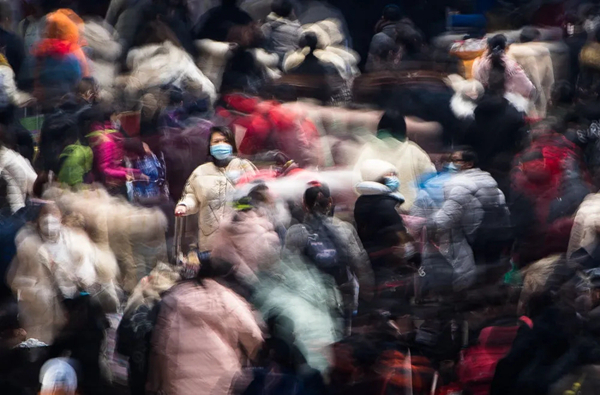 2020年1月22日,在湖北省武漢市漢口火車站,旅客戴口罩進(jìn)站乘車。1月23日,武漢宣布暫時(shí)關(guān)閉離漢通道,在全國(guó)鼎力支持下,進(jìn)入“隔一座城、護(hù)一國(guó)人”的攻堅(jiān)階段。新華社記者 肖藝九 攝