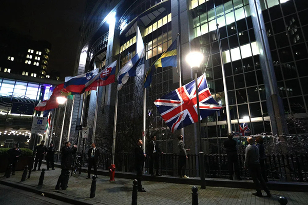2020年1月31日,在比利時(shí)布魯塞爾的歐洲議會(huì)外,工作人員降下英國(guó)國(guó)旗。布魯塞爾當(dāng)?shù)貢r(shí)間1月31日24時(shí)(英國(guó)時(shí)間1月31日23時(shí)),英國(guó)正式脫離歐盟。新華社記者 鄭煥松 攝