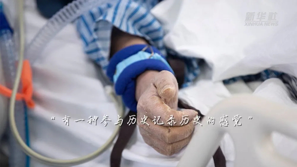 2020年1月24日,在湖北省武漢大學(xué)中南醫(yī)院重癥隔離病房,中南醫(yī)院重癥醫(yī)學(xué)科主任彭志勇(左)與病情好轉(zhuǎn)的患者黃淑麗互道新春快樂。新華社記者 熊琦 攝