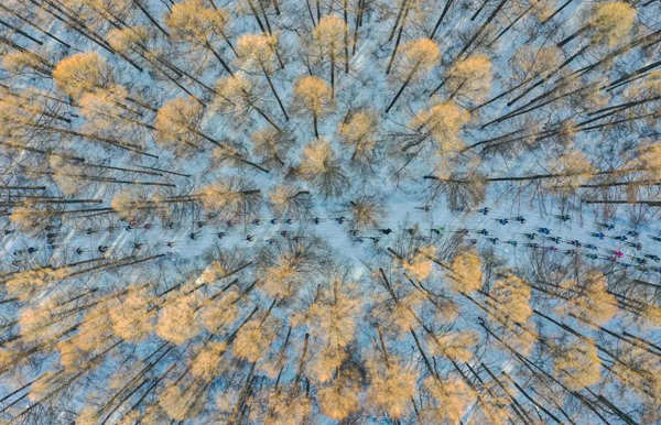 2020年1月4日,參賽選手在2020中國(guó)長(zhǎng)春凈月潭瓦薩國(guó)際滑雪節(jié)暨2020國(guó)際雪聯(lián)越野滑雪中國(guó)巡回賽長(zhǎng)春站比賽中(無(wú)人機(jī)照片)。新華社記者 許暢 攝