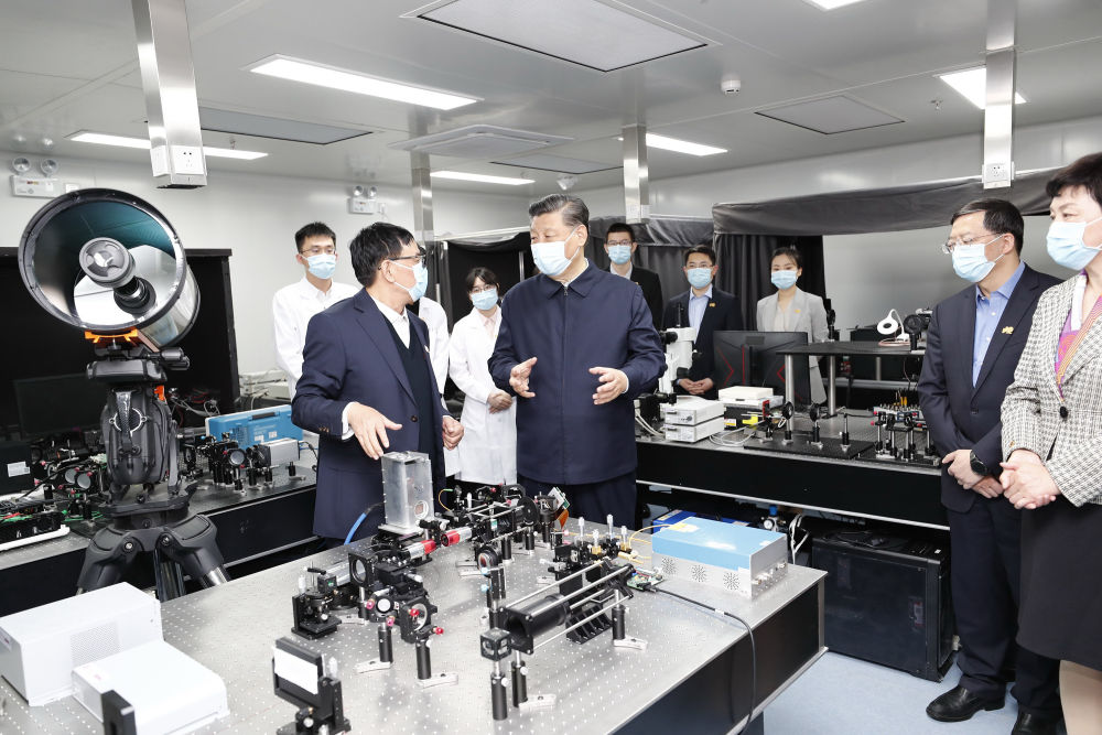 ↑2018年5月2日,習近平在北京大學金光生命科學大樓一層大廳認真聽取關(guān)于學校學科建設(shè)、人才隊伍建設(shè)、科研創(chuàng)新能力提升等情況介紹。