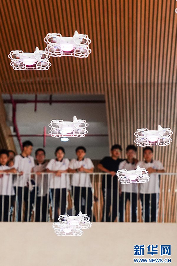 9月12日,福州第三中學(xué),師生操作無(wú)人機(jī)進(jìn)行編隊(duì)飛行表演。新華網(wǎng) 肖和勇 攝