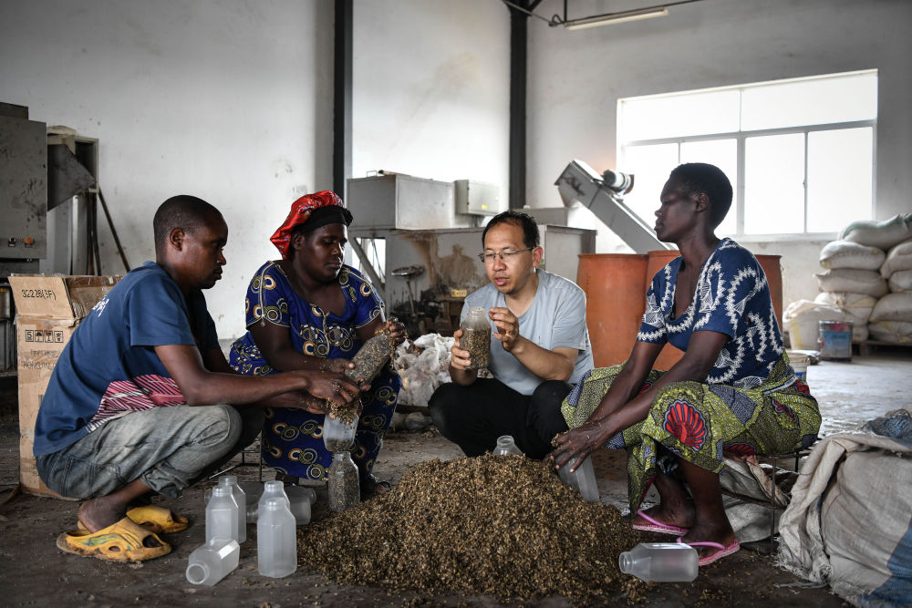 2024年8月13日,在盧旺達南方省胡耶區(qū)的中國援盧農業(yè)技術示范中心,菌草專家陳曉斌(右二)與當地農民一起制作菌種培養(yǎng)料。新華社記者 韓旭 攝