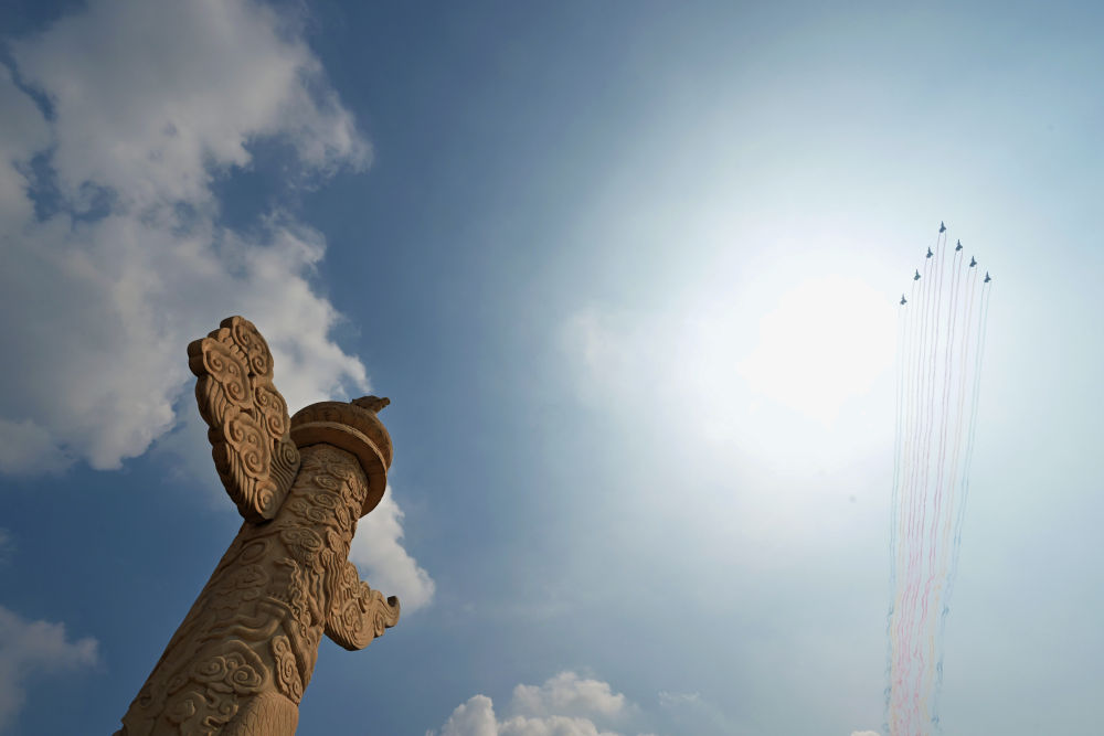 9月3日,紀(jì)念中國人民抗日戰(zhàn)爭暨世界反法西斯戰(zhàn)爭勝利80周年大會(huì)在北京隆重舉行。這是空中護(hù)旗梯隊(duì)接受檢閱。新華社記者王婧嬙攝