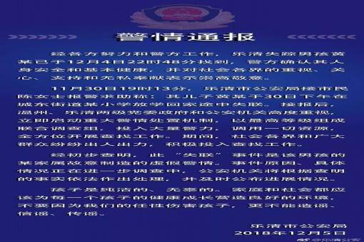 浙江省樂清市公安局官方微博5日凌晨發(fā)布警情通報稱,經(jīng)各方努力和警方工作,樂清失蹤男孩黃某已于12月4日22時48分找到,警方確認(rèn)其人身安全和基本健康,并對社會……