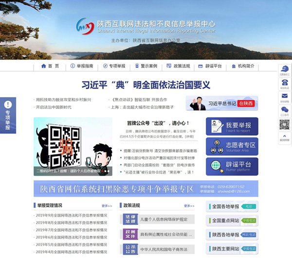 陜西省網絡舉報中心官網“陜西互聯(lián)網違法和不良信息舉報中心”網站上線于2017年2月5日,主要功能是開展網絡舉報工作宣傳,受理網民對網絡違法和不良信息舉報,開展針對網絡謠言的識謠辟謠工作,以及配合相關部門做好網絡輿情的正面引導。“陜西網絡聯(lián)合辟謠平臺”是陜西網絡辟謠聯(lián)盟的官方網站,上線于2017年7月28日,主要用于宣傳、受理和發(fā)布重要辟謠信息及公布相關工作數(shù)據(jù)。