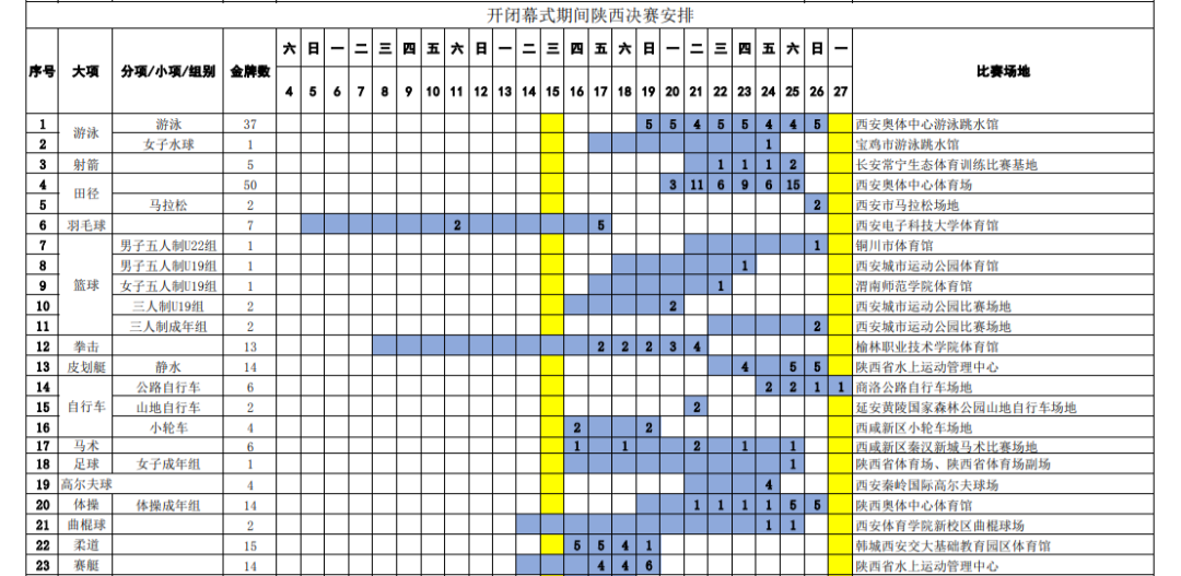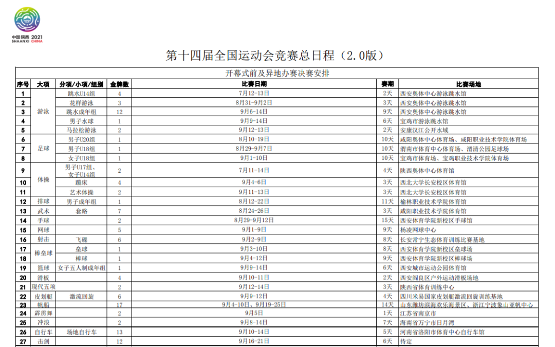 8月3日,國家體育總局辦公廳公布了第十四屆全國運動會競賽總日程(2.0版)。根據(jù)東京奧運會賽程,以及疫情防控工作需要,國家體育總局調整了部分項目的競賽日程。vTn安康新聞網(wǎng) vTn安康新聞網(wǎng) vTn安康新聞網(wǎng) vTn安康新聞網(wǎng) vTn安康新聞網(wǎng)