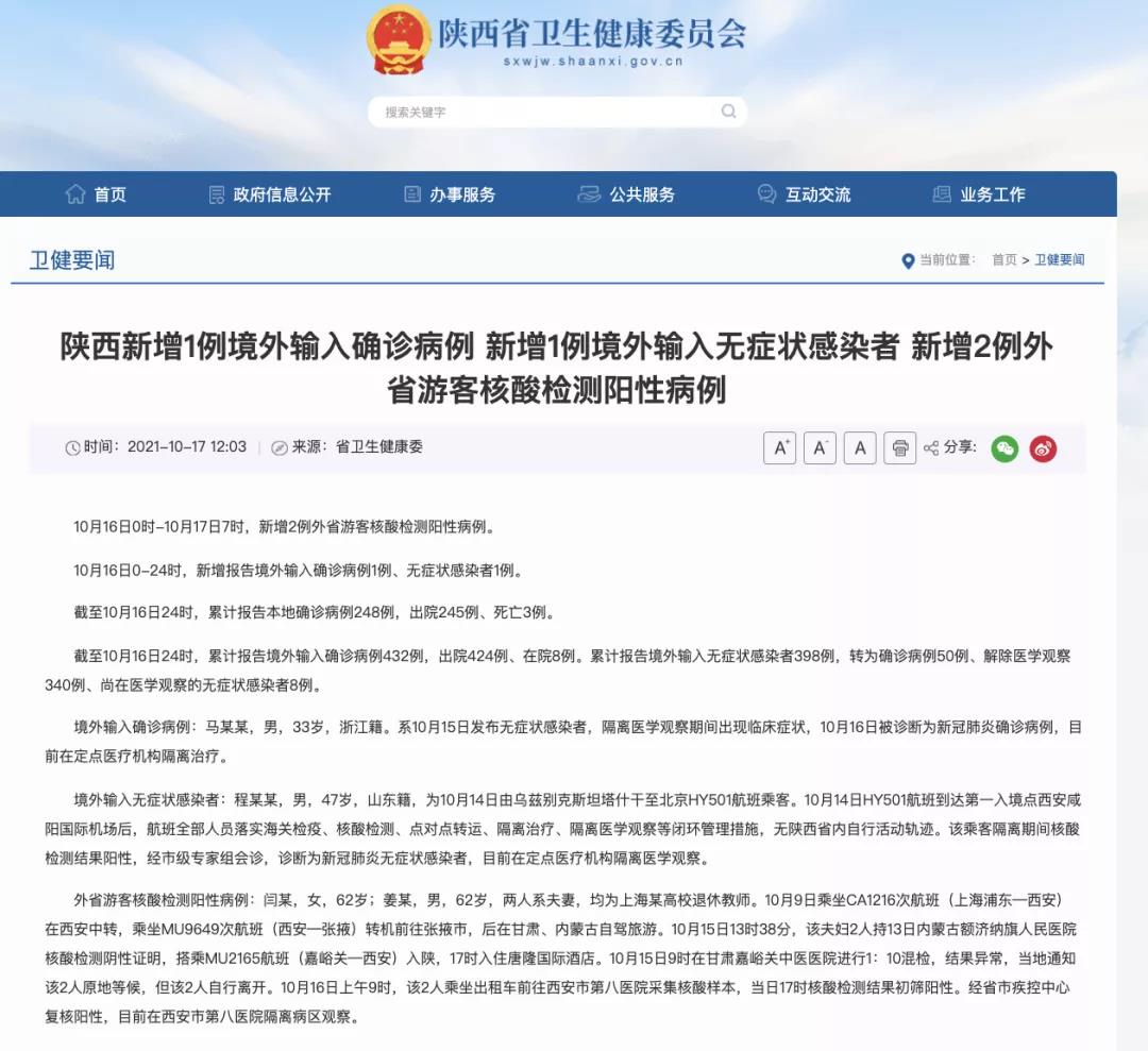 陜西衛(wèi)健委剛剛通報:10月16日0時-10月17日7時,新增2例外省游客核酸檢測陽性病例。