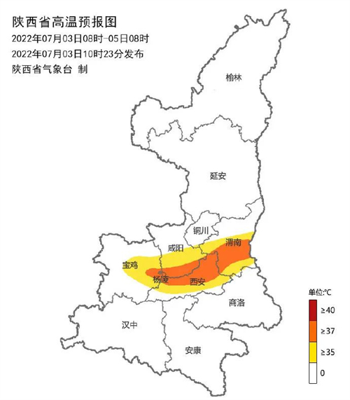 陜西省氣象臺10時23分繼續(xù)發(fā)布高溫藍色預警:受西北氣流影響,預計未來48小時,寶雞東部、咸陽南部、楊凌、西安大部、渭南大部有35℃及以上的高溫天氣,局地可達38℃以上。后期6-11日陜北東部、關中大部、陜南東部有35℃以上高溫天氣,關中南部局地、陜南東部局地最高氣溫可達40℃以上。
