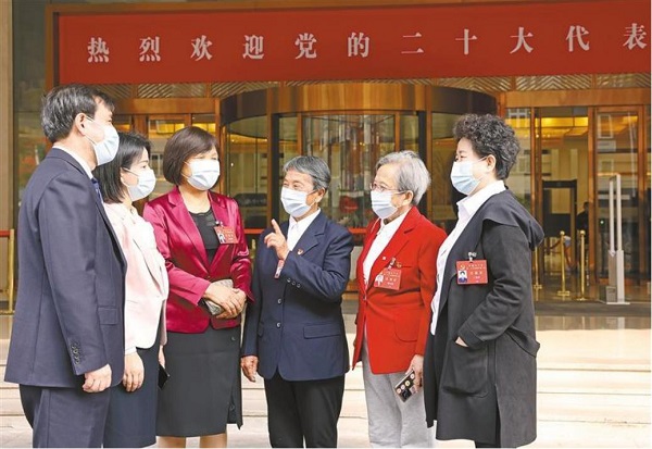 十月十四日,出席黨的二十大的陜西代表王友民、何菲、常亞瓊、張蓮蓮、路生梅、王照輝(左起)在住地交流履職感想。代表們一致表示,將堅決扛起政治責(zé)任,以飽滿的熱情認(rèn)真履行好神圣職責(zé)。