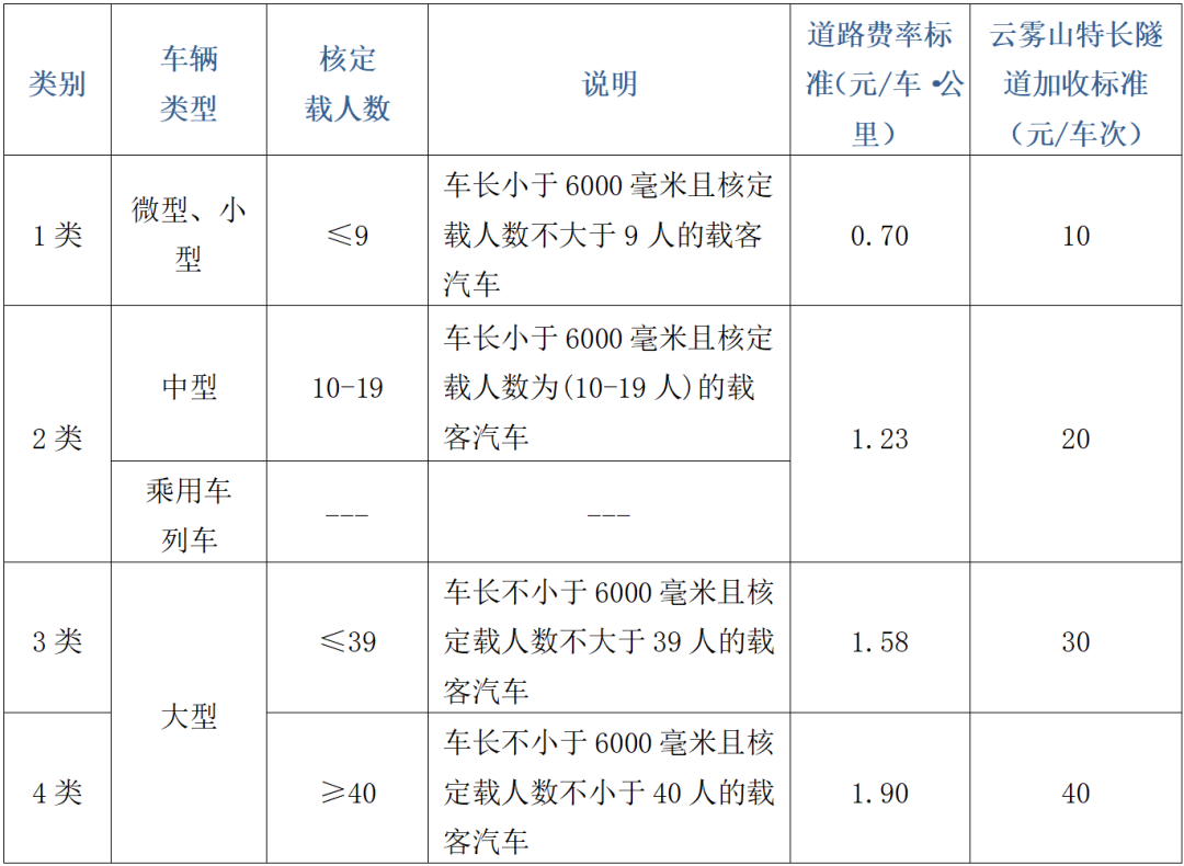 除國家規(guī)定免繳通行費(fèi)的車輛外,其他車輛均須按照《收費(fèi)公路車輛通行費(fèi)車型分類》(JT/T489-2019)及下列收費(fèi)標(biāo)準(zhǔn)繳納車輛通行費(fèi)。