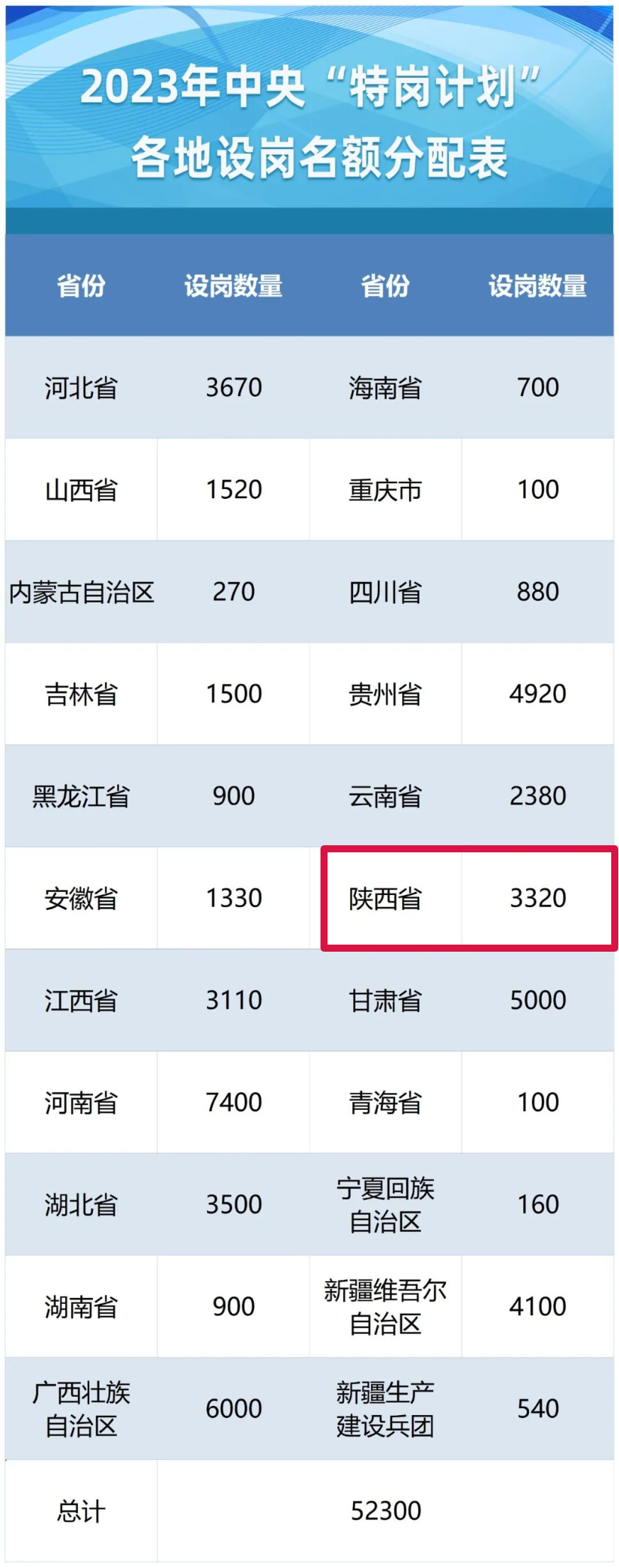 為深入貫徹黨的二十大精神,進一步落實《中共中央 國務院關于全面深化新時代教師隊伍建設改革的意見》,加強新時代教師隊伍建設,實現(xiàn)鞏固拓展脫貧攻堅成果同鄉(xiāng)村振興有效銜接,教育部、財政部近日聯(lián)合印發(fā)《關于做好2023年農村義務教育階段學校教師特設崗位計劃實施工作的通知》,全國計劃招聘特崗教師52300名,其中陜西招聘3320名。分配表如下→