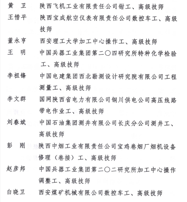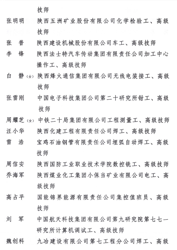 2022年“三秦工匠”稱號(hào)獲得者名單