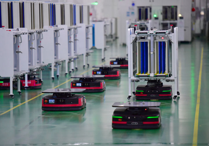 智能搬運機器人在隆基單晶硅太陽能電池工廠內(nèi)工作(2024年3月6日攝)。新華社記者 邵瑞 攝