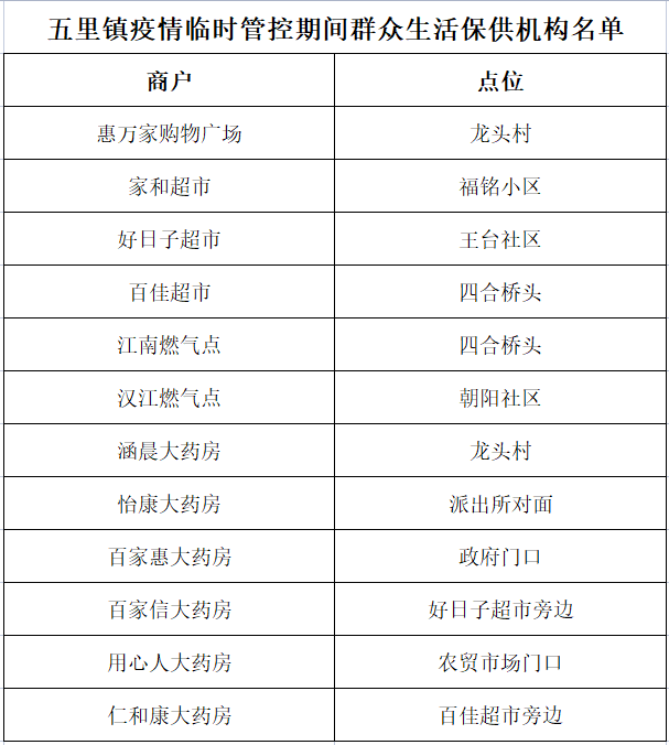 附:五里鎮(zhèn)疫情臨時管控期間群眾生活保供機構名單