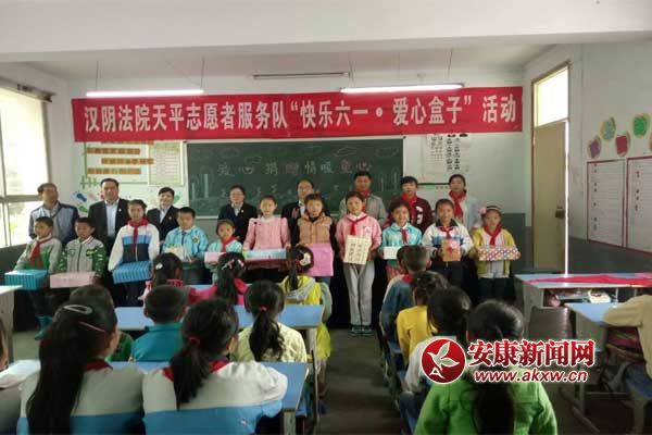 5月27日,漢陰縣人民法院天平志愿服務(wù)隊(duì)5余名志愿服務(wù)者冒雨從縣城驅(qū)車50余公里,走進(jìn)漩渦鎮(zhèn)堰坪小學(xué),將60余份裝有乒乓球拍、圖書、文具等學(xué)習(xí)用品的“愛心盒子”送到留守兒童手中,讓孩子們感受“六一”的快樂。