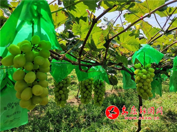 園子里20余畝葡萄在陽(yáng)光的沐浴下早已熟透,串串掛滿枝頭,剝開(kāi)紙袋,葡萄緊密飽滿,散發(fā)著誘人的果香,顆顆晶瑩剔透、碩大如棗,惹人喜愛(ài)。