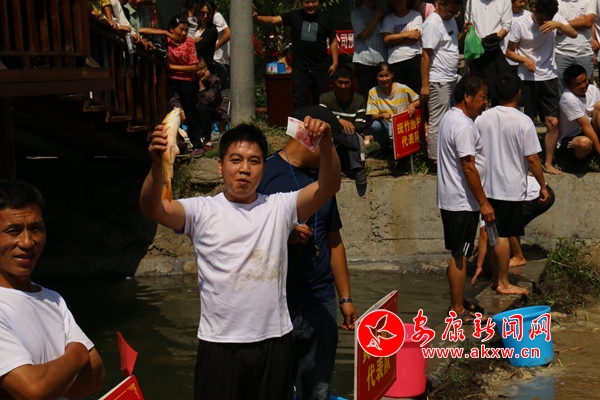 “抓魚比賽開始……“隨著一陣陣吆喝聲,不遠(yuǎn)處的稻田里,圍觀者把稻田圍得密不透風(fēng)。哨子聲一響,只見各村參賽選手們脫鞋挽袖赤腳,沖進泥水中彎腰低頭摸魚開始摸魚,圍觀的村民們不約而同地息聲屏氣。“抓住了!”忽地探入水中的手停住了,選手吆喝了一聲,逮到魚兒的選手激動不已,高高舉起鮮活扭動的魚兒。頓時稻田上空一陣歡呼,大家歡聲笑語打成一片……選手們徒手捉魚,高高舉起 “戰(zhàn)利品”放聲歡呼,享受捕獲魚兒帶來的喜悅,滿臉泥漬也掩蓋不住內(nèi)心的歡喜。