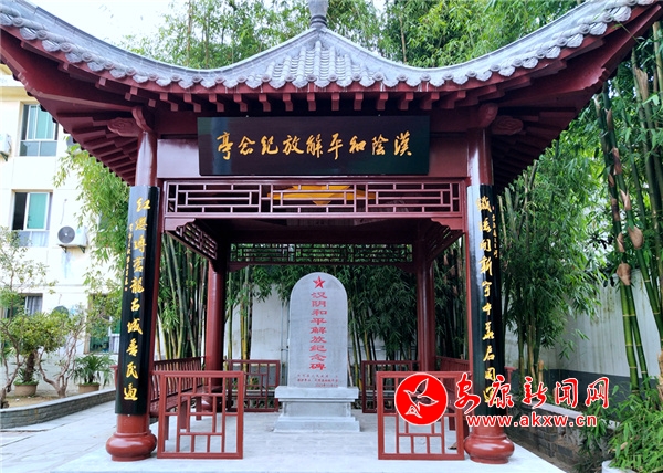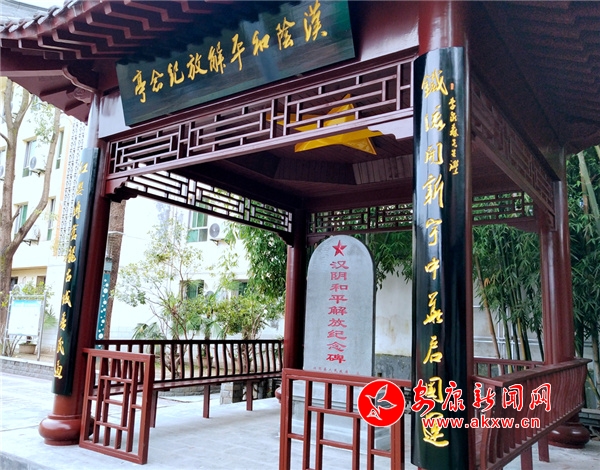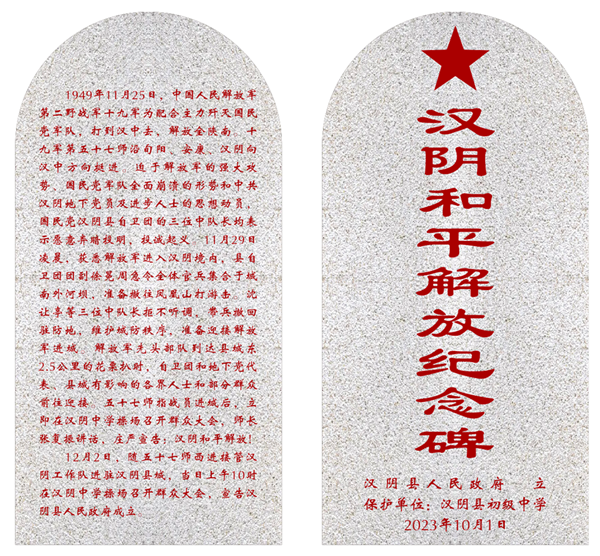 漢陰和平解放紀(jì)念碑、紀(jì)念亭矗立于漢陰縣初級(jí)中學(xué)(原漢陰中學(xué)所在地)操場東北角。紀(jì)念碑上“漢陰和平解放紀(jì)念碑”九個(gè)醒目的大字,承載著在中國共產(chǎn)黨的領(lǐng)導(dǎo)下,漢陰各族人民為爭取解放而進(jìn)行英勇奮斗的光輝歷程。“鐵流開新宇中華啟國運(yùn),紅纓縛蒼龍古城喜民通。”和平解放紀(jì)念亭上的鎏金匾額則是由漢陰本土知名作家李泉森撰寫,知名書法家張正生所題寫。4WS安康新聞網(wǎng)