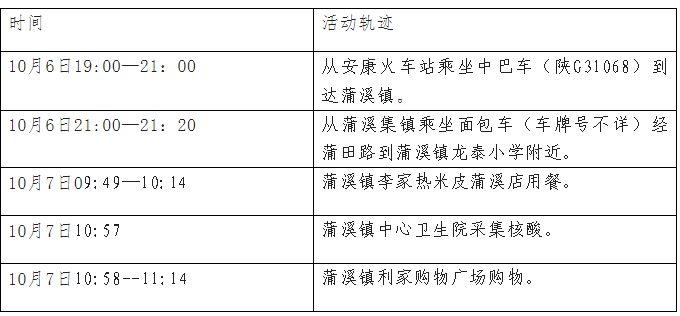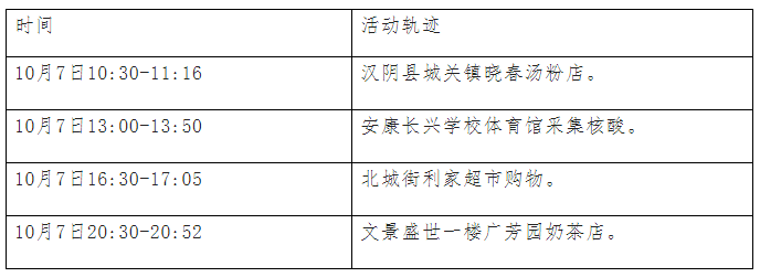 根據(jù)流調情況,現(xiàn)將外市核酸檢測陽性病例涉及密切接觸者在漢陰縣的公共場所活動軌跡公布如下: