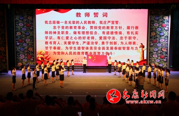 演出現(xiàn)場(chǎng),對(duì)石泉中學(xué)等10 個(gè)“一流教育質(zhì)量單位”,李超旗等10名一流學(xué)校校長(zhǎng),陳興蘭等30名“一流教學(xué)能手”,楊細(xì)雨等50 名“三愛(ài)標(biāo)兵”進(jìn)行了表彰獎(jiǎng)勵(lì),2019年新入職的教師代表進(jìn)行了宣誓,老教師重溫了誓詞。