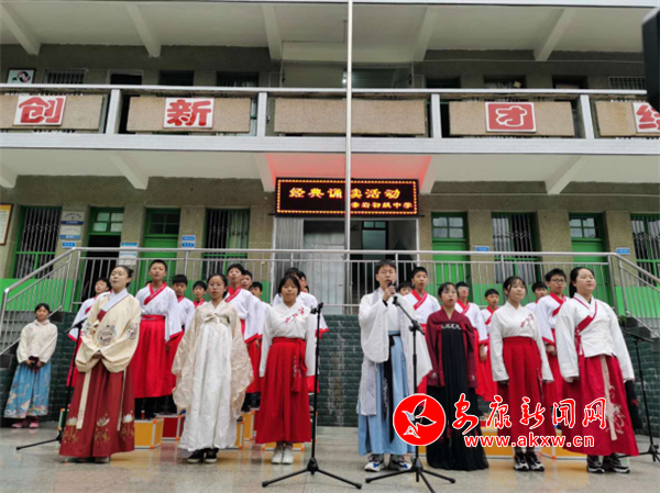 該校在抓學(xué)生閱讀的同時(shí)更注重學(xué)生對(duì)經(jīng)典篇目的誦讀和傳承。每周一早上在升旗儀式后舉行經(jīng)典篇目的誦讀,學(xué)生參與率達(dá)到百分百。各班發(fā)揮才智,形式多樣,有個(gè)人領(lǐng)讀、集體誦讀,更有班級(jí)通過(guò)演唱、戲曲、話劇等形式演繹經(jīng)典。