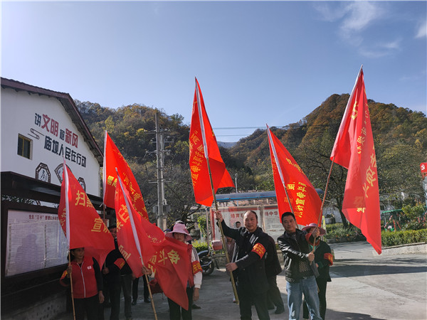 金秋時(shí)節(jié),在上竹鎮(zhèn)各村落,肩扛紅旗的宣傳隊(duì)伍行走在鄉(xiāng)間小路,為上竹鎮(zhèn)平安建設(shè)工作忙碌著。