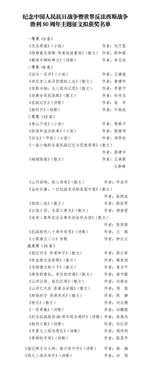 紀(jì)念中國人民抗日戰(zhàn)爭(zhēng)暨世界反法西斯戰(zhàn)爭(zhēng)勝利80周年主題征文評(píng)審結(jié)果公示