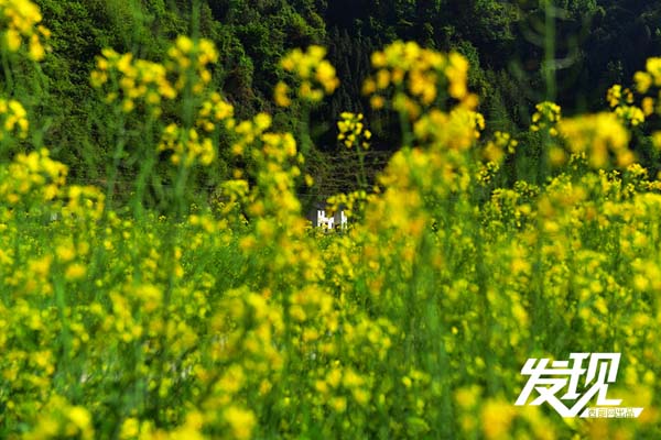 在油菜花中忽明忽暗的特色民居,展現(xiàn)了人與田的完美結(jié)合。